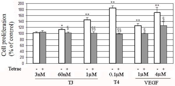 | Figure 2: Presence of Integrin β3 receptor on HMVEC-C cells. Expression levels of Integrin β3 were determined by Western blot analysis (A) and by sq RT-PCR (B) in cells in the absence or presence of T3 (1 μM), T4 (0.1 μM) or Tetrac (T) (1 μM) after 24 hrs. |