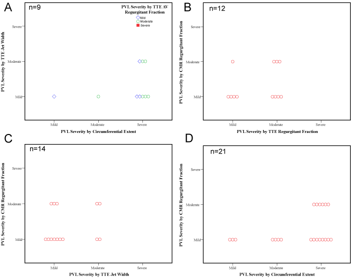 | Figure 3: Scatter-plots of the agreement between parameters for the evaluation of paravalvular leak severity. Panel A: Scatterplot of echocardiographic (TTE) parameters; jet width, circumferential extent, and regurgitant fraction. Note severity by regurgitant fraction is depicted in different colors and shapes. Panel B-D: Scatterplots depicting agreement between PVL severity classification by cardiac magnetic resonance imaging (CMR) and the following echocardiographic parameters: regurgitant fraction (B), jet width (C) and circumferential extent (D). |