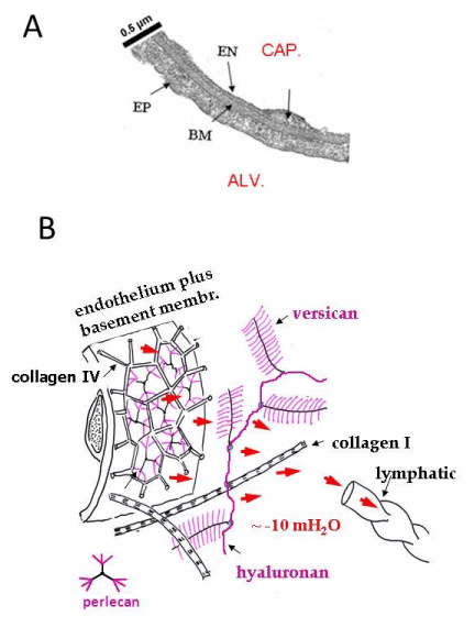 barrier (ABB). A: Transmission electron microscopy image of the ABB to show the extreme thinness of the endothelial and epithelial cells and intervening interstitial basement membrane (EN, EP and BM, respectively). B: the lymphatic pump sets a sub-atmospheric pulmonary interstitial pressure that, in turn, entrains a minimalmicrovascular filtration owing to the low permeability of the capillary endothelium. In black laminar (collagen IV) and fibrillar (collagen I) components of the macromolecular interstitial matrix; in pink the family of proteoglicans link proteins controlling endothelial permeability (perlecan) and mechanical stability of the extracellular matrix (hyaluronan and versican). |
