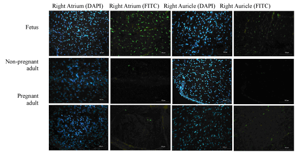 of fetal, pregnant and adult sheep.Representative images of the right auricle and right atrium from fetal, pregnant and adult sheep are shown (magnitude 200×). Niche-like SSEA-4 positive areas labeled with FITC were observed in right auricle and right atrium tissues from fetal sheep samples, but were not identified in the left ventricle and apex. The SSEA-4 positive areas in the right auricle, right atrium and left ventricle from pregnant adults and non-pregnant adults were sparse. |