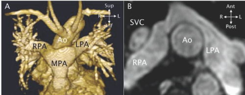 | Figure 26: CMR exam in two patients after an arterial switch operation. A - Frontal view of a 3 - D reconstruction from a MRA showing the anterior pulmonary artery (MPA) with the branch pulmonary arteries (RPA, LPA) on either side of the ascending aorta. (Reprinted from Valente et al. [11] with permission). B - A 3D SSFP in axial projection showing the distorted contours and proximal narrowing of the branch pulmonary arteries (RPA, LPA). The ascending aorta (Ao) is seen between the branch pulmonary arteries and the superior vena cava (SVC) in front of the RPA. |