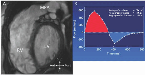 | Figure 33: A - MRI cine SSFP short - axis image in a patient late after repair of TOF. The RV is dilated due to severe pulmonary insufficiency from wide patch plasty of the RV outflow. B - Graph of instantaneous flow velocity vs time calculated from a phase contrast MR sequence prescribed across the right ventricular outflow. Antegrade flow is shown above baseline (red) and retrograde or regurgitant flow below (blue). The area under each portion of the curve indicates volume flow which is used to calculate the regurgitant fraction. |