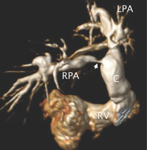 | Figure 35: 3D reconstruction of a MRA in an adult patient after repair of TOF with pulmonary atresia. Multiple collateral arteries were unifocalized with the central pulmonary arteries and connected to the right ventricle (RV) using a conduit (C). There is severe proximal stenosis (white arrowhead) of the right pulmonary artery (RPA). LPA left pulmonary artery. |