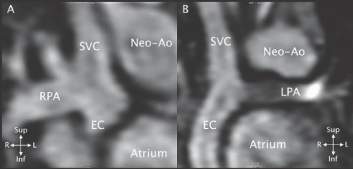 | Figure 41: MRI 3D SSFP frontal views in a patient with hypoplastic left heart syndrome after extracardiac conduit Fontan operation. A - The Glenn anastomosis between the superior vena cava (SVC) and the right pulmonary artery (RPA) is seen. The junction of the extracardiac conduit (EC) with the inferior aspect of the RPA is seen but the rest of the conduit is out of the plane. The neo - aorta (Neo - Ao) is to the left of the SVC. B - The conduit (EC), SVC and left pulmonary artery (LPA) are seen but the RPA is out of plane. As frequently seen the LPA is smaller than the RPA. Note that the conduit is separate from the atrium. |