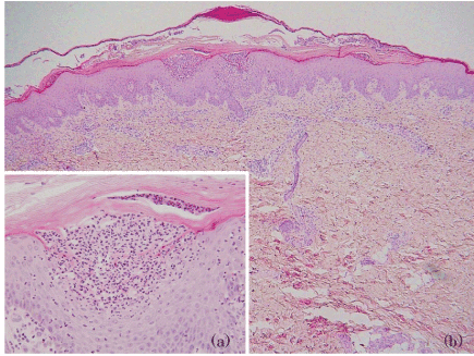 | Figure 2: Pathological findings of the skin lesions. (a) Biopsy of an abdominal pustule showed a spongiform pustule of Kogoj formed by neutrophils in the upper spinous and granular layers. (b) The epidermis showed parakeratosis and elongation of the rete ridges. The upper dermis contained an infiltrate of lymphocytes and neutrophils, migrating from the capillaries into the epidermis. |