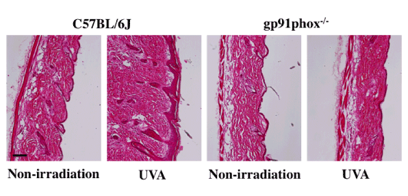 | Figure 1: Effects of UVA irradiation. Six hours after the final irradiation of the dorsal skin in the C57BL/6j and gp91phox-/- mice, skin specimens were obtained and fixed with 4% PFA. Thin sections of the skin specimens were stained with hematoxylin-eosin (Scale bar=100 μm). |