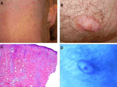 | Figure 4: A) Clinical exam notable for faint flesh colored papules on back of neck; B) Clinical exam notable for depigmentation of the nipples and areolae; C) Histopathologic exam of papules demonstrate prominent interfollicular granulomatous inflammation (Hematoxylin and eosin stain, 400x magnification); D) Wood’s light exam demonstrating enhancement of the nipples and areolae. |