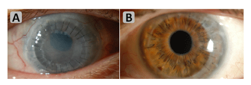 | Figure 1: Regraft status after 9 months of immunosuppressive protocol. Complete graft failure is shown in (A), demonstrating microcystic edema, endothelial failure, conjunctival hyperemia, and some corneal vascularization. (B) demonstrates clear graft after a complete course of triple therapy. |