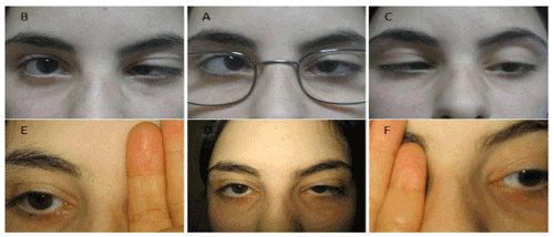 | Figure 1: Early post-operative period of amniotic membrane transplantation. A: Pre-operative picture of patient 1 in primary position. B: Pre-operative picture of patient 1 showing right abduction deficit (-4). Figure 1-C: Preoperative picture of patient 1 showing left abduction deficit (-4). D: Postoperative picture of patient 1 in primary position. E: Post-operative picture of patient 1 showing right abduction deficit (-2). F: Post-operative picture of patient 1 showing left abduction deficit (-2). |