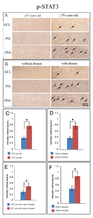 | Figure 2: p-STAT3 levels in human eye tissue visualized with Vector Blue (blue) and counterstained with neutral red (pink). (A) Cells (arrows) in the ganglion cell layer (GCL), inner nuclear layer (INL), and outer nuclear layer are found to be immunoreactive (vector blue) for phosphorylated (activated) STAT3 in the older group (≥ 70 yr). (B) Similarly, immunolabeling profile is seen in eyes with drusen ≥ 25 μm regardless of age. Scale bar 30 μm.p-STAT3 accumulation significantly differs (p ≤ 0.05, black asterisk) in the retinal layers between the analyzed groups. STAT3 activation is greater in older eyes (C, ≥ 70 yr, n = 14), in eyes with clinically significant drusen (D, ≥ 25 μm, n = 14) and particularly in eyes with large drusen (F, ≥ 63 μm, n = 10). In the younger group (E, ≤ 57 yr, n = 14), the presence of drusen ≥ 4 μm (n = 7) is associated with increased STAT3 activation compared to eyes without drusen (n = 7). |