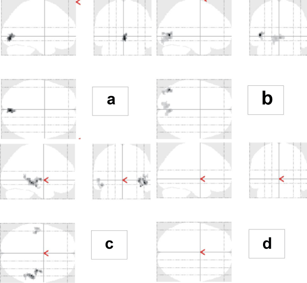 | Figure 2: Shows regions which are activated more significantly during the BW stimulation (top - a, b) and inversely, during the YB stimulation (bottom - c, d). The left column represents results in the controls (a, c) and the right column shows the patients (b, c). |