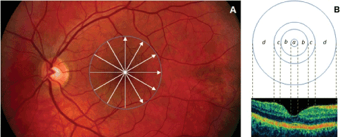 | Figure 2: Custom-built method showing macular sectors. A) Fundus image of a healthy eye showing the STRATUS OCT’s radial lines protocol. B) Regions shown are: foveola (a) with a diameter of 0.35 mm, foveal region (b) with a diameter of 1.85 mm, parafoveal region (c) with a diameter of 2.85 mm and perifoveal (d) region with a diameter of 5.85 mm. |