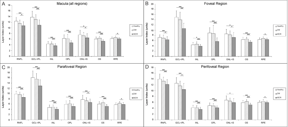 | Figure 5: Layer index changes in each macular region and intraretinal layer in the eyes of healthy subjects and diabetic patients with no or mild diabetic retinopathy (DM and MDR, respectively). A) Macular region, B) Foveal region, C) Parafoveal region and D) Perifoveal region. For the description of layer abbreviations see the text or Figure 1. * 0.001<p<0.05 and *** p<0.001 (ANOVA followed by Newman-Keuls post hoc analysis) |