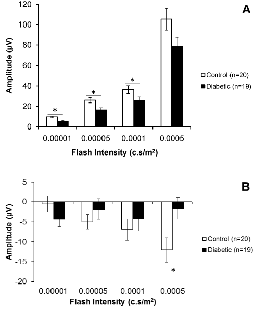 | Figure 1: Positive scotopic threshold response for 11 week old Ins2Akita mice. The scotopic threshold response was measured in diabetic Ins2Akita mice after 6-7 weeks of hyperglycemia (n=20), and compared to wild-type litter mates (n=19). Flash intensities of 0.00001 and 0.00005 c.s/m2 are considered to be in the scotopic range. The higher flash intensities presented here mark the first positive peak, but will also include bipolar cell signal from the encroaching b-wave. (A) The positive scotopic threshold response (pSTR) amplitude was smaller in hyperglycemic mice compared to wild-type littermates (*p<0.05). (B) The amplitude of the negative scotopic threshold response (nSTR) was not significantly different in the diabetic Ins2Akita mice compared to wild-type controls. The significantly reduced amplitude at flash intensity of 0.0005 c.s/ m2 is outside the scotopic range and may represent a difference in the regular ERG response (*p<0.05). |