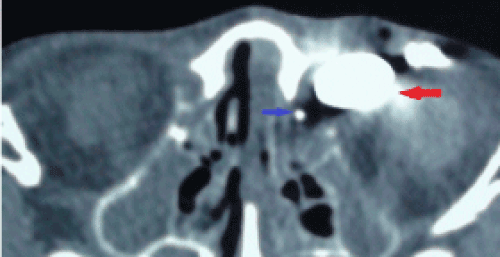 | Figure 1D: Axial computed tomography: Injection of contrast material from orificium fistula and normal lacrimal puncta (first patient). Red arrow: lacrimal diverticulum filled with contrast material; Blue arrow: normal lacrimal sac filled with contrast material. |