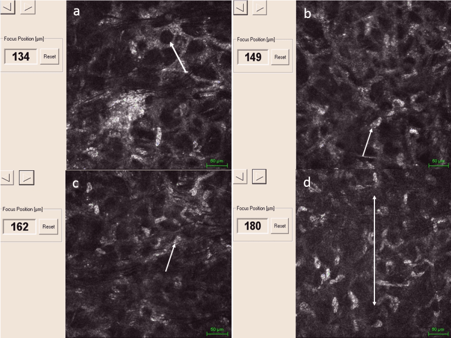 | Figure 1: Accelerated corneal collagen crosslinking Group 1 (epitheliumoff): Riboflavin 0.1% plus Dextran 20%, 15 min of corneal soaking, UV-A power at 12 mW/cm2, Energy dose at 7.2 J/cm2), 10 min exposure time. Left (a) white arrow: biomicroscopic picture of demarcation line after treatment. Right (b) white arrows: corneal OCT imaging revealing the demarcation line after A-CXL at about 180 μm of depth (range 150-200 μm). |