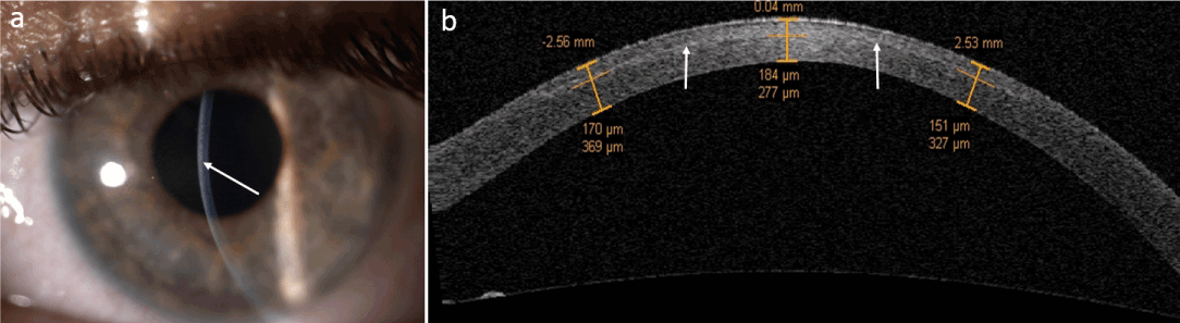 | Figure 2: Accelerated corneal collagen crosslinking Group 1 (epitheliumoff): Riboflavin 0.1% plus Dextran 20%, 15 min of corneal soaking, UV-A power at 12 mW/cm2, Energy dose at 7.2 J/cm2), 10 min exposure time. Postoperative confocal scans revealed lacunar edema (upper left white arrow-a) with keratocytes apoptosis (upper right white arrow - b; bottom left white arrow-c) and increased density of extracellular matrix surrounding edema. A transition between hypo-cellular stroma and stroma unreached by the treatment (vertical transition area) is showed in bottom left - d scan with an estimated penetration depth of 180 μm (range 160-200 μm). |