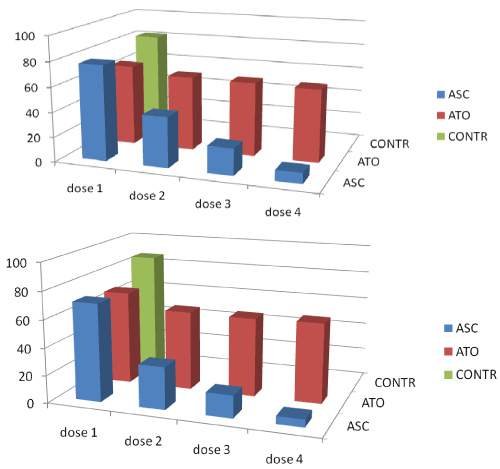 | Figure 3: Diagram representing the percentage of live OCM1 and C918 UM cells after continuous exposure to either ASC or ATO for 18-24 hours. Green bars=control (no treatment) sample. Red bars=ATO. Blue bars=ASC. Dose 1=ASC 1mM or ATO 2 μg/ml; Dose 2=ASC 3mM or ATO 4 μg/ml; Dose 3=ASC 5 mM or ATO 6 μg/ml; Dose 4=ASC 7 mM or ATO 8 μg/ml. |