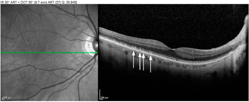 | Figure 4: Pseudo-drusen are best distinguished from standard drusen via optical coherence tomography. Whereas cuticular drusen and soft drusen appear as round punctate accumulations under the retinal pigment epithelium (RPE), pseudo-drusen (or subretinal drusenoid deposits) are interconnected accumulations above the RPE. |
