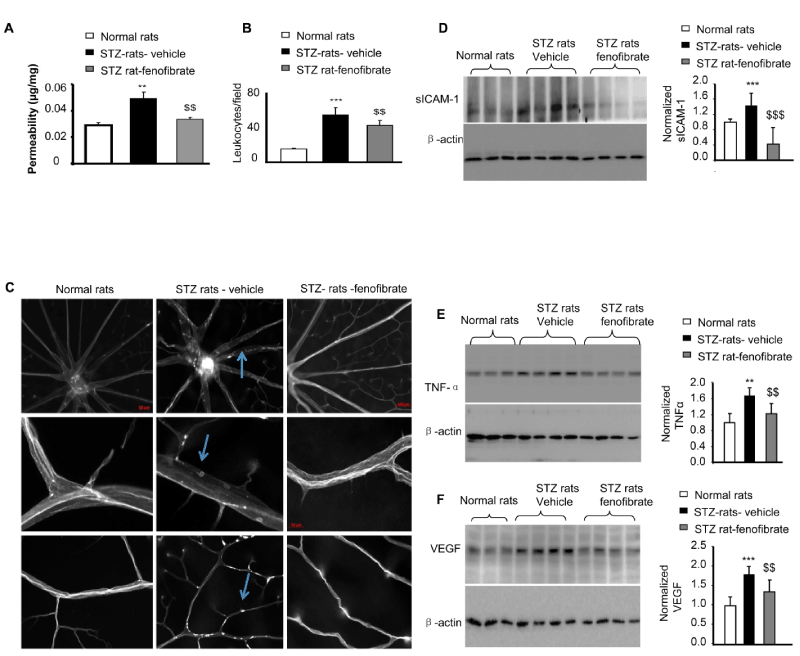 | Figure 3: Topical fenofibrate ameliorates retinal inflammation and reduces retinal vascular leakage in type 1 diabetic animals. STZ-induced diabetic rats were topically administered fenofibrate (15 μl/eye, 3 times/day for 4 weeks) 6 weeks after diabetes onset, and an identical volume of the vehicle served as the control. (A) Retinal vascular leakage was quantified using a vascular permeability assay (mean ± SD, n =5; **P <0.01 STZ vehicle vs. nondiabetic rats (NDM); $$P <0.01 STZ-fenofibrate vs. STZ-vehicle). (B,C) The retinal vascular endothelium and adherent leukocytes were stained using FITC-conjugated Con-A following the removal of circulating leukocytes. The retinas were flat mounted, and adherent leukocytes were visualized using fluorescence microscopy. (B) Leukocyte quantification indicated that topical fenofibrate significantly reduced adherent leukocytes in the retinal vasculature from diabetic rats (mean ± SD, n =7, *** P <0.001 STZ vehicle vs. nondiabetic rats (NDM); $$ P <0.01 STZ-fenofibrate vs. STZ-vehicle). (C) Representative images of retinal flat mounts from nondiabetic rats, STZ-induced diabetic rats treated with vehicle, and diabetic rats treated with fenofibrate eyedrops (30 μl/eye, 3 times/day for 4 weeks) are shown. Scale bar, 100 μm in the first row panel, 50 μm in the second and third row panels. (D-F) Western blot analysis of retinal soluble form ICAM-1 (sICAM-1), TNF-α, and VEGF levels in equivalent amounts (50 μg) of retinal proteins. Each lane represents an individual rat (mean ± SD, n =3 or 4; *STZ vehicle vs. non-diabetic rats (NDM); $STZ-fenofibrate vs. STZ-vehicle; * or $P <0.05; ** or $$P <0.01; *** or $$$P <0.001). |