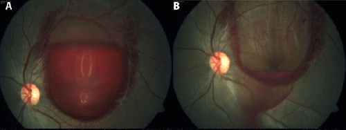 | Figure 1: A 38-year old male presented to our outdoor patient department with a history of sudden painless loss of vision in the right eye since one day after lifting a heavy suitcase off the ground. The rest of his history and systemic examination was unremarkable. His corrected distance visual acuity was counting fingers close to face in the right eye and 20/20 in the left eye. Ocular examination was unremarkable except for the presence of a mound of subhyaloid hemorrhage, measuring approximately 3 disc diameters in the macular area in the right eye (A). Patient underwent laser membranectomy using the frequency doubled Nd:YAG laser. The settings used were as follows: Power: 450 mw. Duration: 100ms. Spot size: 100 microns. The most dependent area of the hemorrhage was chosen as the target site. Immediately upon successful rupture, a fundus photograph was taken (B). His visual acuity at final follow up was 20/20 in both eyes |