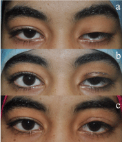 | Figure 5: An example of patient from Group I with Left congenital severe ptosis with poor levaror function a) preoperative b) 1 week postoperative the left upper eyelid was under-corrected which required revision c) one year postoperative with acceptable left eyelid level. |