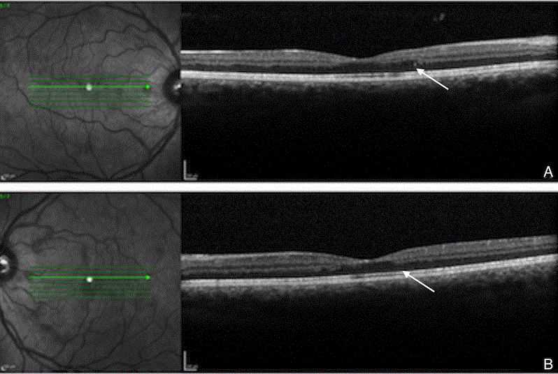 | Figure 2: Optical coherence tomography at time of presentation. A: Spectral-domain optical coherence tomography scan of the right eye at presentation demonstrating gross irregularity of the inner and outer retina with partial loss of the outer plexiform layer. B: Spectral-domain optical coherence tomography scan of the left eye at presentation demonstrating an analogous appearance. |