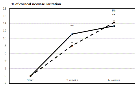 | Figure 1: Graphic rendering of the increasing corneal neovascularization in the lesioned eyes, showing that both fluorescence microscopy (continuous line) and capillaroscopy (dotted lines) give similar trends. **p<0.01 vs. start; ##p<0.01 vs. previous time point. |