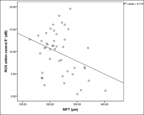 | Figure 3: The relationship between mean foveal thickness and retinotopic ocular sensitivity within the central 5° of the retina, including fixation, in subjects with neovascular age-related macular degeneration. MFT: Mean Foveal Thickness; Db: Decibels; ROS: Retinotopic Ocular Sensitivity |