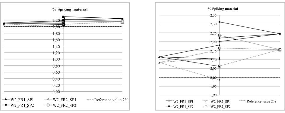 | Figure 8: Sampling results of wheat flour with 2% spiking concentration, comparing SP1, SP2, FR1 and FR2 – 3 repetition rounds (left). Close-up of variations of sampling results (right). Horizontal stippled line represents the nominal reference value. |