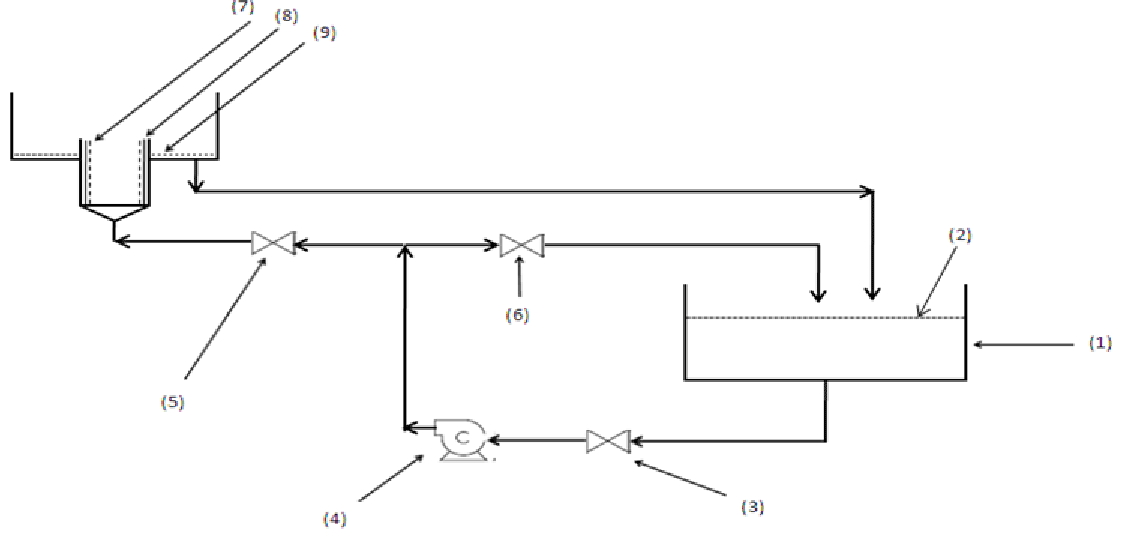 | Figure 2: Continuous electrocoagulation system. (1) Five liter Storage tank. (6) Bypass valve. (2) Contaminated solution. (7) Mesh screen Al anode. (3) Drain valve. (8) Cylindrical Al cathode. (4) Plastic Pump (0.12 hp). (9) Sludge filtration screen. (5) Main valve. |