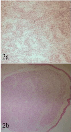 | Figure 2: Microscopic appearances 2a: A number of admixture of compactly arranged interlacing fascicles, Antoni A pattern, and loosely arranged cells separated by clear matrix, Antoni B pattern (H and E; × 100) 2b: Appearance of the right upper eyelid schwannoma that partially surrounded by skin (H and E; × 40). |