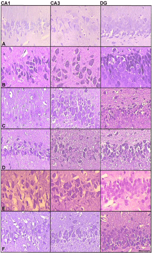 | Figure 2: CA1, CA3 and dentate gyrus areas of hippocampus; A: Hyperthermia and saline (group 2); B: Pilokarpin and saline (group 3); C: Hyperthermia, pilokarpin and saline (group 4); D: Hyperthermia and propofol (group 5); E: Pilokarpin and propofol (group 6); F: Hyperthermia, pilokarpin and propofol (group 7). Scale bar, 25 μm. |
