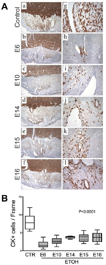 | Figure 6: Consequences of gestational ethanol exposure on invasive trophoblasts. Long Evans dams fed with isocaloric liquid diets containing 0% or 8.2% (v/v) starting from E6, E10, E14, E15, or E16 and placental tissue with underlying mesometrium was harvested on E19. (A) Low magnification [original X 40] images of sections immunostained with cytokeratin antibody (CK) demonstrate the depth and distribution of invasive trophoblastic cells in (a) control and (b-f) ethanol-exposure groups. Reciprocal high magnification images [original X 400] (g-l) exhibit the distribution of invasive trophoblasts around the decidual arteries and within the mesometrialstroma. (B) CKpositive invasive trophoblasts within the mesometrium were quantified using unbiased stereology. Inter-group comparisons were made using ANOVA with Tukey’s multiple comparisons post-hoc test for statistical significance. N=9 (3 placentas/dam) per group. |