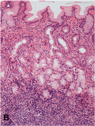 | Figure 2B: Gastric antral mucosa-H pylori-induced chronic gastritis, with marked inflammatory infiltrate in the lamina propria and presence of a lymphoid follicle (arrow). The glands are preserved (arrowheads) although separated by the infiltrate. (H&E, x200). |