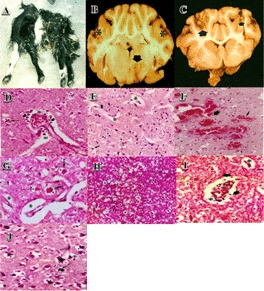 | Figure 1: Histopathological observations on the lesions of amprolium in the brains of the goat. A: Young lamb showing head retraction (opisthotonus). B and C: The distribution of the lesions was bilaterally symmetric foci of yellow malacic in the cerebral cortex. D and E: Perineuronal and perivascular oedema. F: Cerebral lesions were characterised by congestion. G: Increased perineuronal and perivascular spaces, neuronal degeneration with shrunken, angular/ triangular neurons, malacic foci. H: The lesions were comparatively mild and included vacuolation around neurons in grey matter, engorgement of blood vessels, perivascular and perineuronal clear zones indicative of edema. I and J: Polioencephalomalacia of the dorsal cerebral cortex with oedema and status spongiosus, edema and focal hemorrhage was detected in the white matter. |