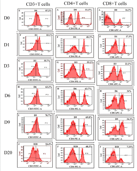 | Figure 3: Flow cytometry of various T cell populations in spleen of GP-IV. Isolated MNCs of immunized spleen were stained with antibody viz. Anti-mouse CD3 (FITC conjugated), CD4 (PE conjugated) and CD8 (APC conjugated). Estimation of total lymphocytes and subset analysis was performed on various days of experiment. With TPA immunization significant increase (p<0.005) was observed in CD3+, CD4+, CD8+ T cells. Data expressed are the mean ± S.D. of the percentage of various cells. |