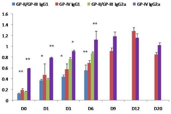 | Figure 6: Antigen specific antibodies response in BALB/c mice immunized with TPA. Sera obtained from TPA immunized animals were analyzed for the presence of malaria-specific IgG isotypes by ELISA. The values expressed are the mean ± S.D. of the absorbance of the pooled sera of immunized animals. #P<0.01; **P<0.0001. |