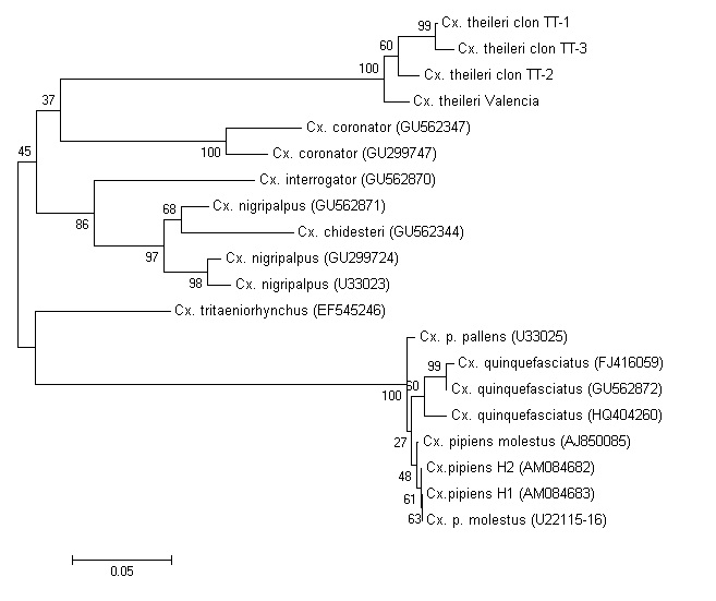 | Figure 1: Phylogenetic tree using rDNA ITS-2 data set nucleotide sequences according to MEGA 5, including the Cx. theileri populations studied, together with other proximal Culex species available in GenBank. Evolutionary relationships of taxa were calculated using the Neighbor-Joining method. The percentage of replicate trees in which the associated taxa clustered together in the bootstrap test (1000 replicates) are shown next to the branches. The tree is drawn to scale, with branch lengths in the same units as those of the evolutionary distances used to infer the phylogenetic tree. The evolutionary distances were computed using the Kimura 2-parameter method and are in the units of the number of base substitutions per site. |