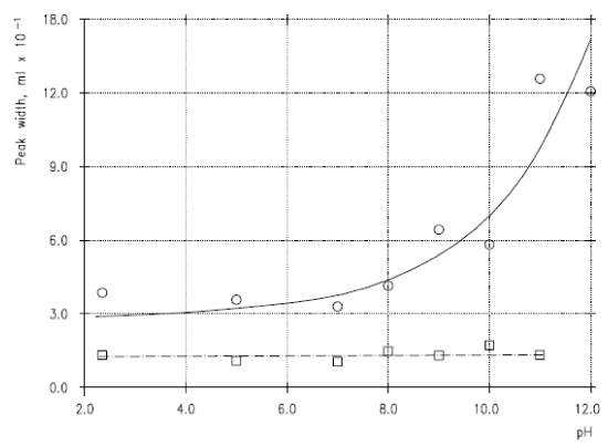 | Figure 2: Corrected peak width as function of pH of SP (circles and solid line) and Tyr-Gly (squares and dash-dotted line) fractionated by the Fractogel HW-40 described under “Chromatographic procedures”. Symbols represent experimental points, lines exponential growth and first degree polynomial interpolation for SP and Tyr-Gly, respectively. Chromatographic conditions as described in the text. |