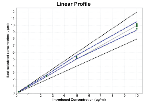 | Figure 6: Linear profile of the analytical method for the determination of HF in human ureter extracts using a linear regression model as calibration curve.The dashed limits on this graph correspond to the accuracy profile, i.e. the expectation tolerance limits expressed in absolute values. The dotted curves represent the acceptance limit at ± 20% expressed in the amount unit. The continuous line is the identify line y=x. |
