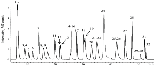 | Figure 1: LC-MS/MS total ion chromatogram resulting from analysis of clean tissue spiked with a mixture of pharmaceutical standards. Peak identifications are as follows: (1) acetaminophen-d4, (2) acetaminophen, (3) atenolol, (4) cimetidine, (5) codeine, (6) 1,7-dimethylxanthine, (7) lincomycin, (8) trimethoprim, (9) thiabendazole, (10) caffeine, (11) sulfamethoxazole, (12) 7-aminoflunitrazepam-d7 (+IS), (13) metoprolol, (14) propranolol, (15) diphenhydramine- d3, (16) diphenhydramine, (17) diltiazem, (18) carbamazepine-d10, (19) carbamazepine, (20) tylosin, (21) fluoxetine-d6, (22) fluoxetine, (23) norfluoxetine, (24) sertraline, (25) erythromycin, (26) clofibric acid, (27) warfarin, (28) miconazole, (29) ibuprofen-13C3, (30) ibuprofen, (31) meclofenamic acid (-IS), and (32) gemfibrozil. (Reproduced with permission from (64), © American Chemical Society). |