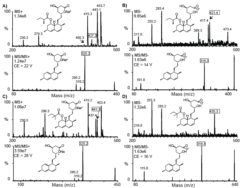 | Figure 1: Q1 full-scan mass spectra (MS) and product ion mass spectra (MS/MS) of LV (A) and LVA (B), and the internal standards SV (C) and SVA (D) The precursor and product ion pairs selected for MRM detection are shown in boxes. The postulated structure of each also is depicted. The signal intensity for the most intense peak is in the upper-left corner of each spectrum. CE, collision energy. |