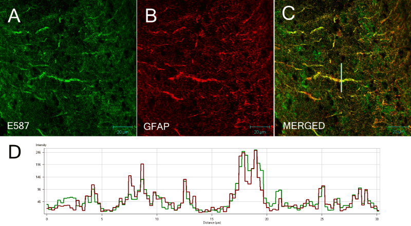 | Figure 5: 20 µm frozen section of optic nerve of Nothobranchius guentheri probed with rabbit E587 antiserum and mouse anti-human GFAP, GA-5. (C) shows a merged image of the red and green channels. The blue line indicates the optical section used to generate the profile in (d) which shows co-localization of red and green signal in the glial processes. Scale bar = 20 µm. |