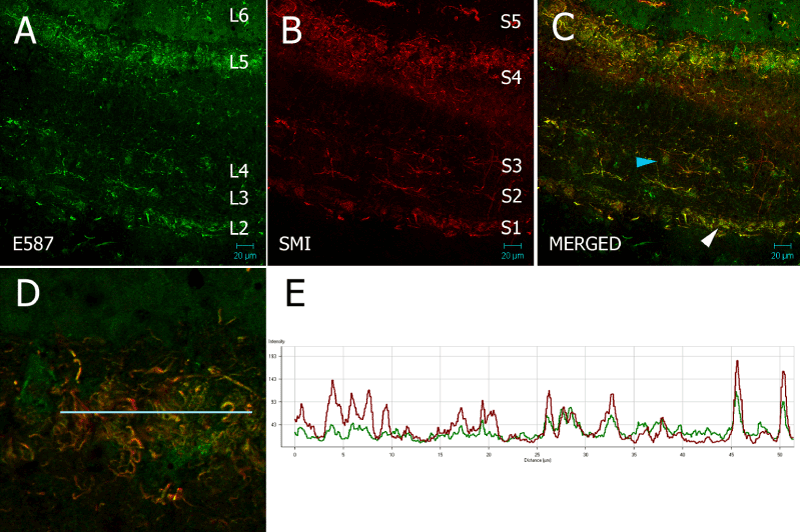 | Figure 8: 20 µm frozen section of optic tectum of Nothobranchius guentheri probed with rabbit E587 antiserum and mouse SMI31. Several discrete SMI31 and E587 layers are evident in (A) and (B) which partially overlap in the merged image (C). Blue arrow in (C) indicates a large E587 cell body, possibly a neuron. White arrow in (C) serves as the centre of focus for (D). Red and green signal in (D) colocalize (frame E) and show a complex of SMI31 and E587 positive fibers in the SGS/SO layer. |