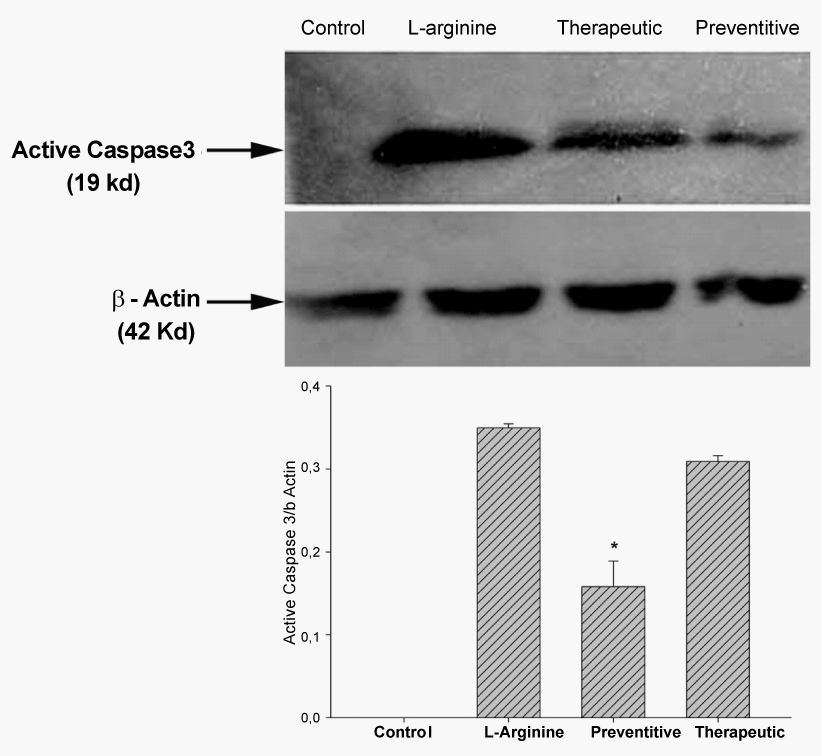 | Figure 3: Western blot analysis of active caspase-3, apoptosis indicator, levels. Control and treated kidneys were homogenized in buffer and subjected to sodium dodecyl sulfate-polyacrilamide gel electrophoresis and western blotting. Bars represent mean ± SEM of active caspase-3 levels (n=10). * versus L-arginine-given and therapeutic; p<0.001. |