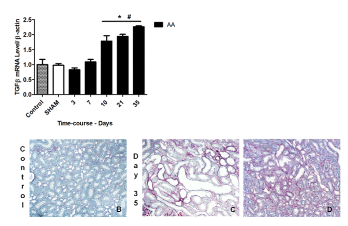 | Figure 2: Time course of fibrosis progression. Quantitative real-time PCR of TGF-ß mRNA was performed with kidney tissue from all experimental groups (A). Representative photographs of Sirius red staining in OSOM in control rat (B) and at day 35 (C&D) (x200). Values are means ± SEM. N=6 in each group. *p ≤ 0.05 versus SHAM rat at corresponding time-point. |