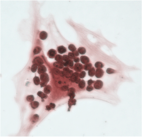 | Figure 1: A group of mouse leukemic T cells NOTCH1+ in a culture medium that provides a niche mimicking in vivo conditions. Leukemic cells are in the presence of IL-7 and FLT3, and have an intimate relationship with thymus stromal cells. Magnification: 400X. (Caceres-Cortes JR and Hoang T; IRICMontreal, Canada). |
