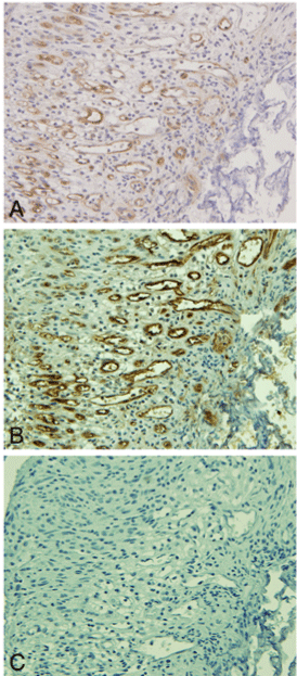 | Figure 2: NKCC1 and AQ1 in chronic subdural hematomas. (A) NKCC1 immunoreactivity is extensive in capillaries and sinusoids infiltrating the chronic subdural hematoma. (B) AQ1 immunoreactivity in capillaries of the same subdural hematoma as in (A). (C) Control (Hematoxylin counterstain and diaminobenzidine chromagen; original magnification 400x). |