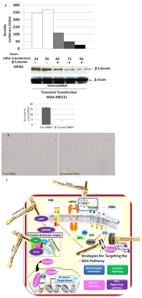 A: MDA-MB231 TNBC cell line, was transiently transfected with beta-catenin SiRNA for three different time points (48-96 hours) and beta-catenin protein was determined by Western blot B: Genetic attenuation of beta-catenin in MDA-MB231blocked VM over 6 hours. Bars represent mean number of semi-quantified vessels counted per randomly chosen field, *P<0.001 (n= 10) C: Schematics of WP are represented with the tools used in the study. |